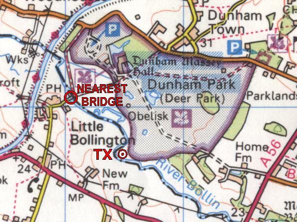 Description: Dave Holland, back from Spitzbergen for the festive period was able to compete in this DF using his wife's car, making this one of the largest ever turnouts for a local event. John Jocys wasn't difficult to find on site, in fact he wasn't hidden at all, but as you can see from the map it was very difficult to know which side of the river to go for, and the nearby pylons also helped throw the signal. John was between the river and the brick boundary wall of Dunham Park (which made approaching the site from inside Dunham Park impossible). Chris Heys guessed the wrong side of the river and approached the south. John gave Chris a wave from the opposite bank of the river and it was a further 15 minutes running for Chris as he legged it across fields and fences to the nearest bridge to cross over the river.